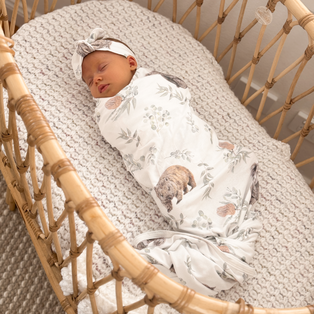 Our gorgeous Australiana print is the perfect gender neutral print. Designed with soft Australian animals and iconic leaves, this swaddle has quickly become a favourite in our collection and is now available in our Jersey swaddle and matching beanie.