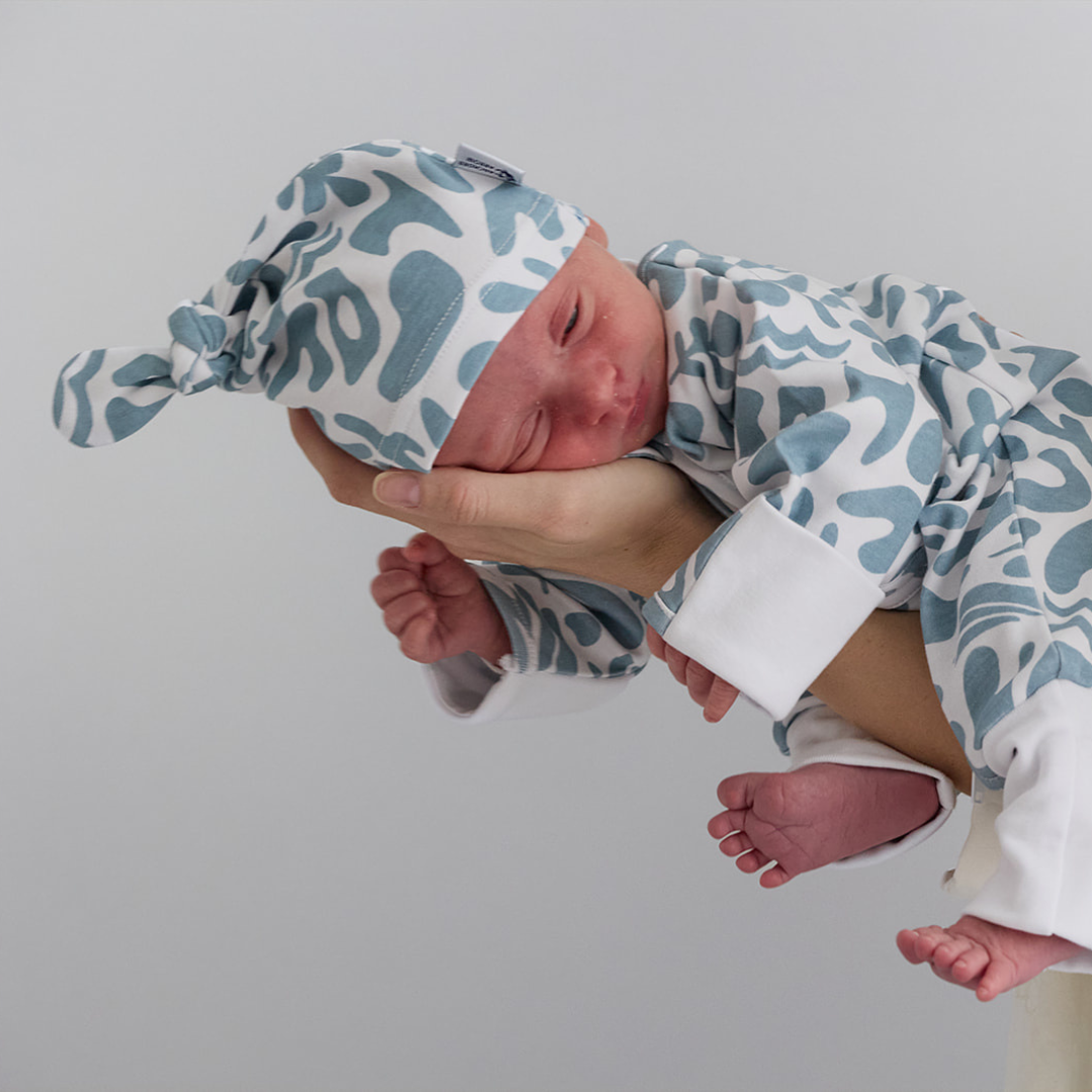 To complete the look with our new Blue Swirl Romper, this hand-painted design is available in a cute beanie.
