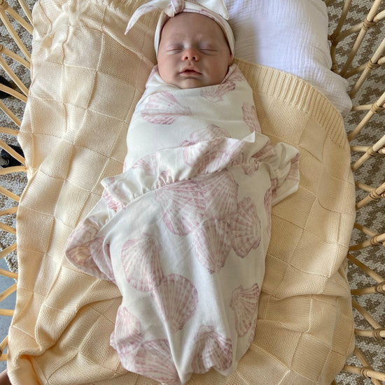 To complete the look with our best selling Sea Shells print, this hand-painted design is available in a cute top knot.